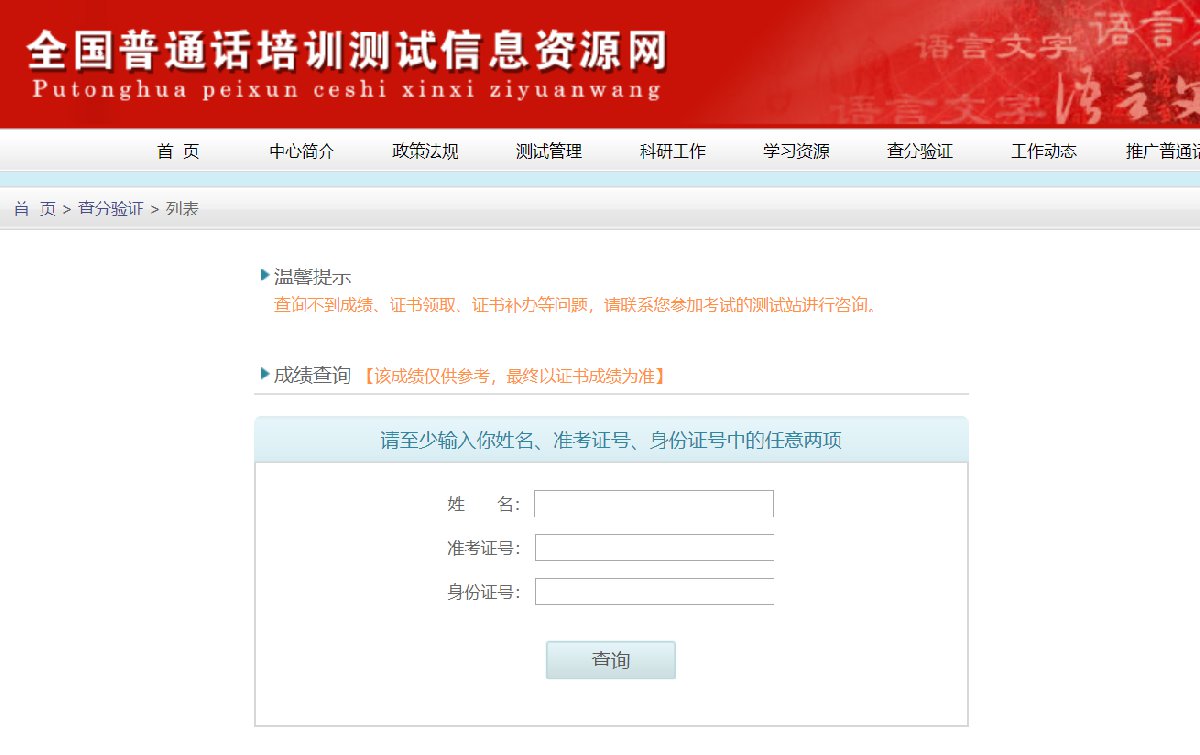 输入姓名、准考证号、身份证号中的任意两项即可查询,该成绩仅供参考,最终以证书成绩为准。