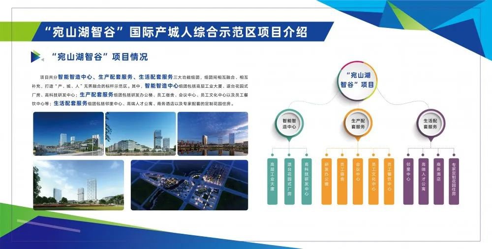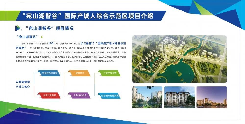 项目以智能智造产业为核心,构建世界级装备、电子产业集群,融入智慧城市、绿色城市概念和产业、生活服务支持系统,旨在打造以产业为中心,生产配套、生活配套两翼齐飞的产业新城。“宛山湖智谷”项目建成后计划引入符合园区产业规划的生产、销售、科研型或总部企业、生产性服务业企业800多家,整个园区目标年产值为120亿元,目标年纳税8亿元。