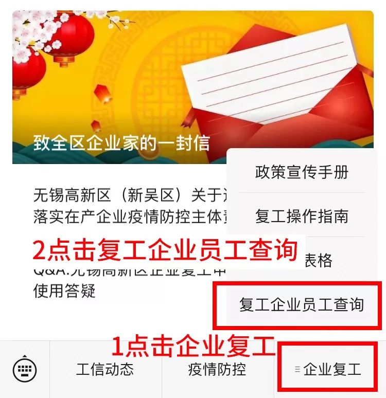 一、关注无锡高新区(新吴区)工业和信息化局官方微信公众号“无锡高新工信”,点击菜单栏“企业复工”¹,点击上拉菜单中“复工企业员工查询”²,进入跳转页面。