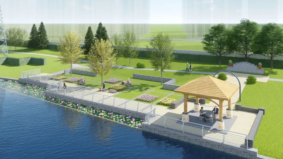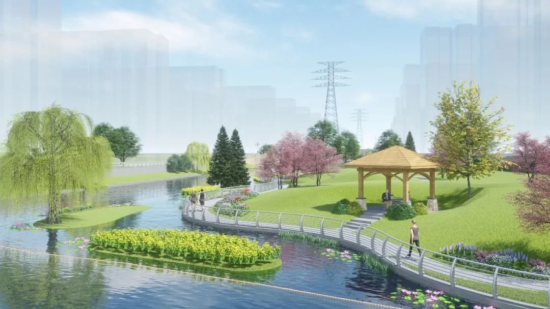 整个项目,北起通锡高速公路,南至长江东路,两侧为已建成的丽景佳苑一、二期以及三期启动区南北地块,以“打造滨水休闲绿廊、共创邻里品质生活”为目的,里夫泾浜河两岸设计了文化回廊、剪影墙、樱花谷、菖蒲湾、月季园、花田观莲、荷塘月色、采芳园、童趣天地、滨河步道等一系列景观。
