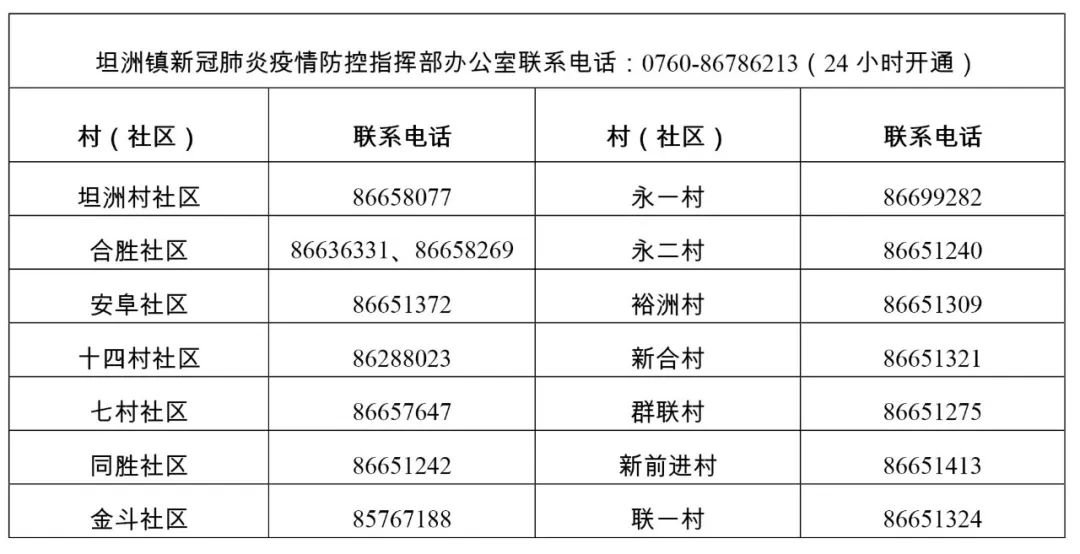 坦洲镇新冠肺炎疫情防控指挥部办公室及各村(社区)联系方式