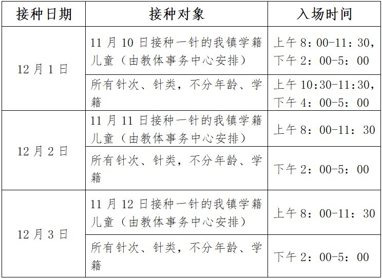 为保证我镇3-11岁儿童二针的接种秩序,体育馆接种点12月1-3日接种时间安排如下: