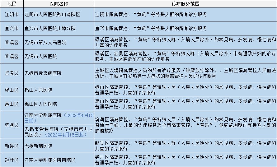 二、隔离管控人员有发热、呼吸道感染等新冠肺炎十大症状的,主城区的人员至无锡市传染病医院就诊,江阴市的人员至江阴市人民医院敔山湾院区就诊,宜兴市的人员至宜兴市人民医院川埠分院就诊;其它综合性医疗服务至相应的指定医院就诊(名单如下)。有就医需求请与管理人员联系,做好个人防护,由专车转运就诊,全程闭环管理。