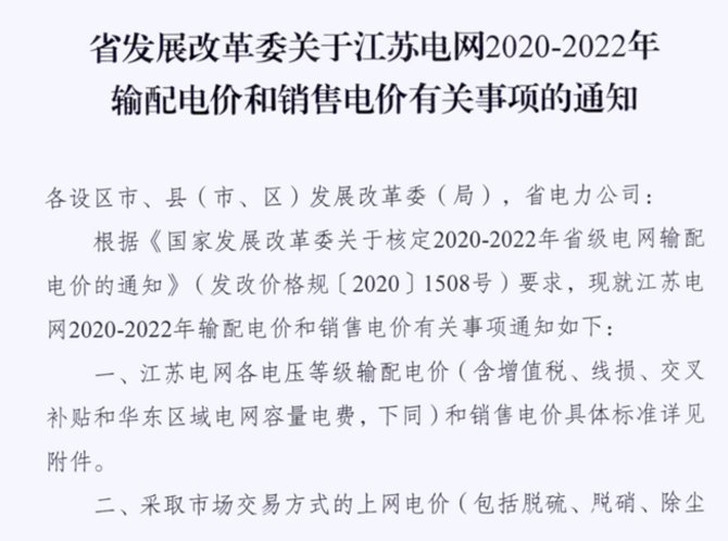 为持续推进输配电价改革,进一步降低企业用电成本,近日,江苏省发展改革委制定出台了江苏电网第二监管周期输配电价和销售电价,印发《关于江苏电网2020—2022年输配电价有关事项的通知》,明确自2021年1月1日起执行新的输配电价和销售电价。