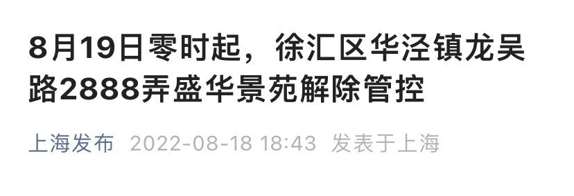 上海市新冠肺炎疫情防控工作领导小组办公室8月18日发布消息:根据《新型冠状病毒肺炎防控方案(第九版)》要求,经研究决定,自2022年8月19日零时起,将徐汇区华泾镇龙吴路2888弄盛华景苑解除管控,上海市其他区域风险等级不变。