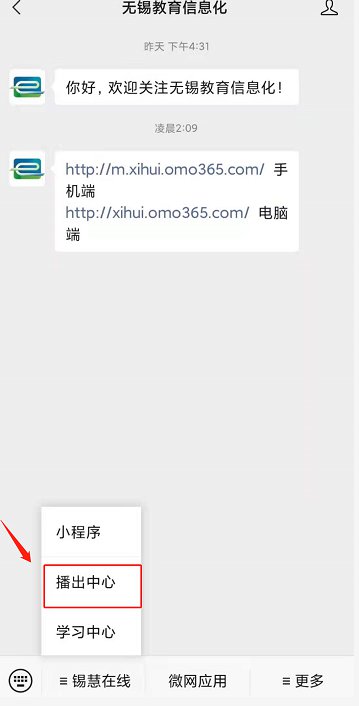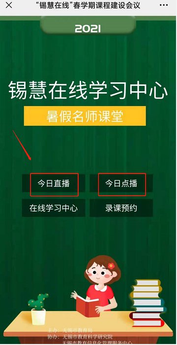 关注微信公众号“无锡教育信息化”或“无锡在线学习中心”,点击菜单进入“锡慧在线”→播出中心