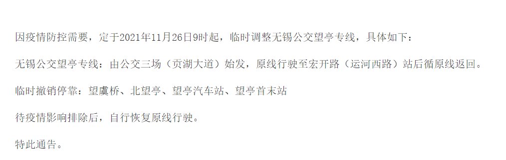2021年11月26日9时起公交望亭专线(公交三场——望亭首末站)暂时撤销苏州范围内的4个站点(望虞桥、北望亭、望亭汽车站、望亭首末站)。