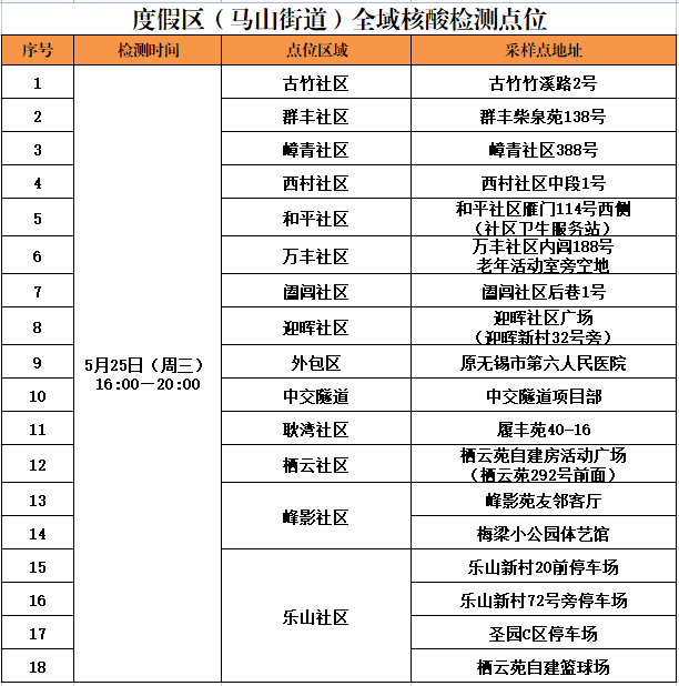 根据无锡市疫情防控指挥部统一部署,度假区(马山街道)定于5月25日在辖区范围内开展全域核酸检测,现将有关事项通知如下: