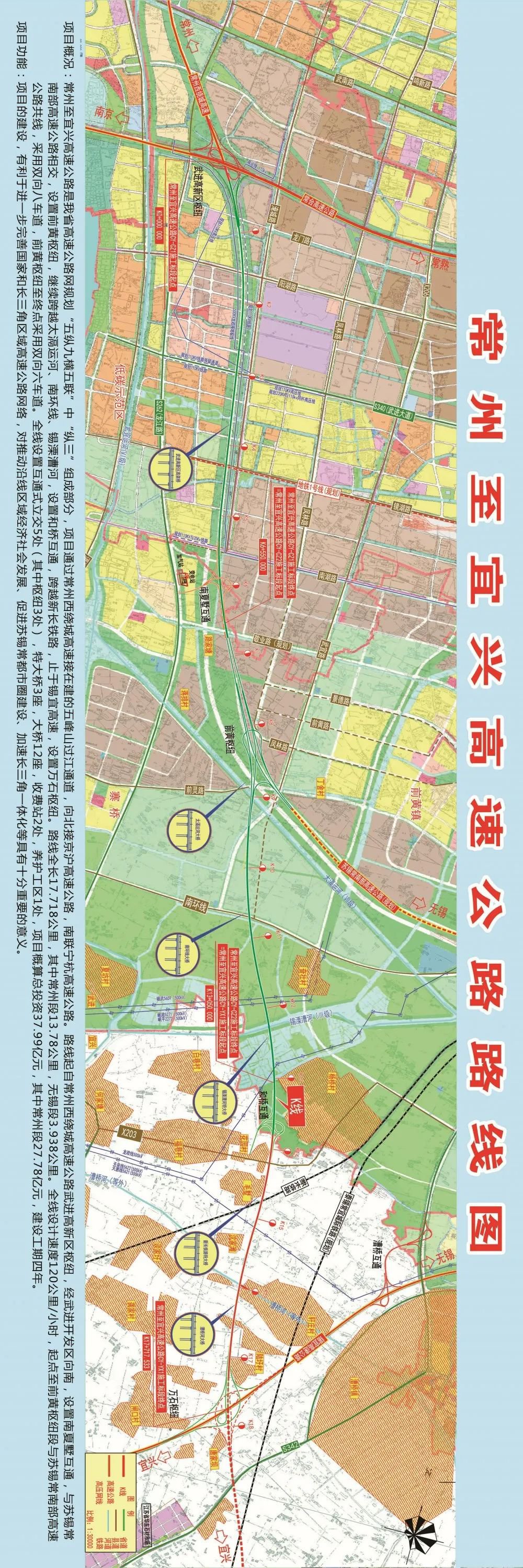 它是《江苏省高速公路网规划(2017—2035年)》“十五射六纵十横”的“射六”“纵四”组成部分,起自常州西绕城高速公路武进高新区枢纽,止于锡宜高速公路万石枢纽,路线全长17.718公里,其中常州段13.780公里,无锡段3.938公里。