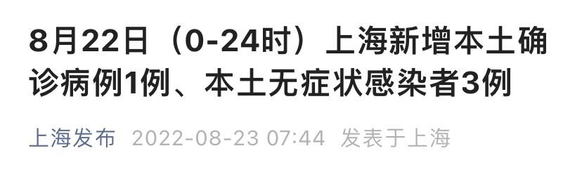 上海市卫健委8月23日通报:2022年8月22日0—24时,新增本土确诊病例1例和无症状感染者3例,均在隔离管控中发现。