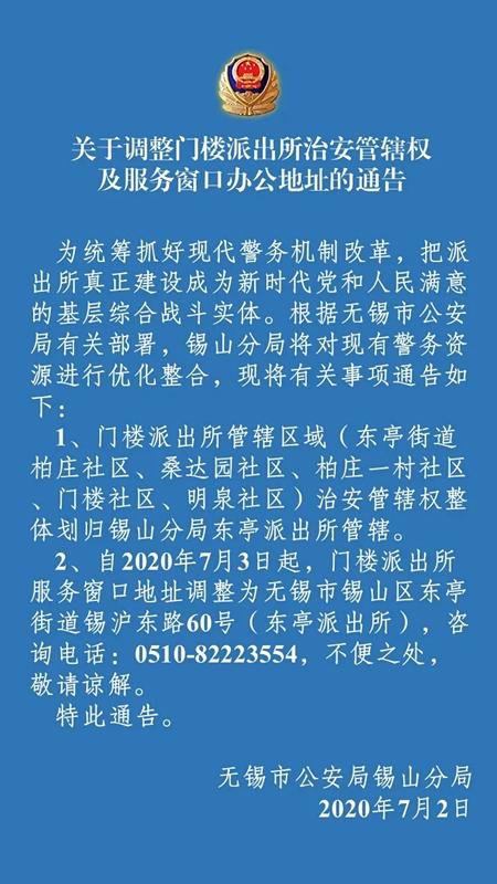 2、自2020年7月3日起,门楼派出所服务窗口地址调整为无锡市锡山区东亭街道锡沪东路60号(东亭派出所),咨询电话: 0510-82223554, 不便之处,敬请谅解。