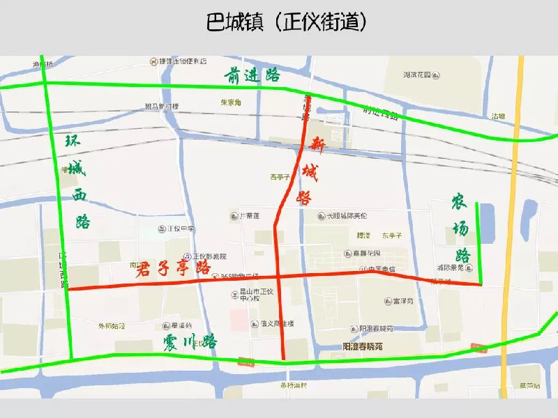 新城路(前进路—震川路)路段,君子亭路(环城西路-农场路)路段;