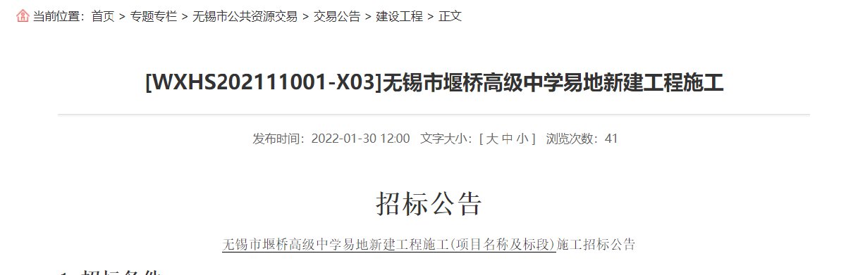 根据无锡市人民政府网公布的无锡市堰桥高级中学易地新建工程施工招标公告显示