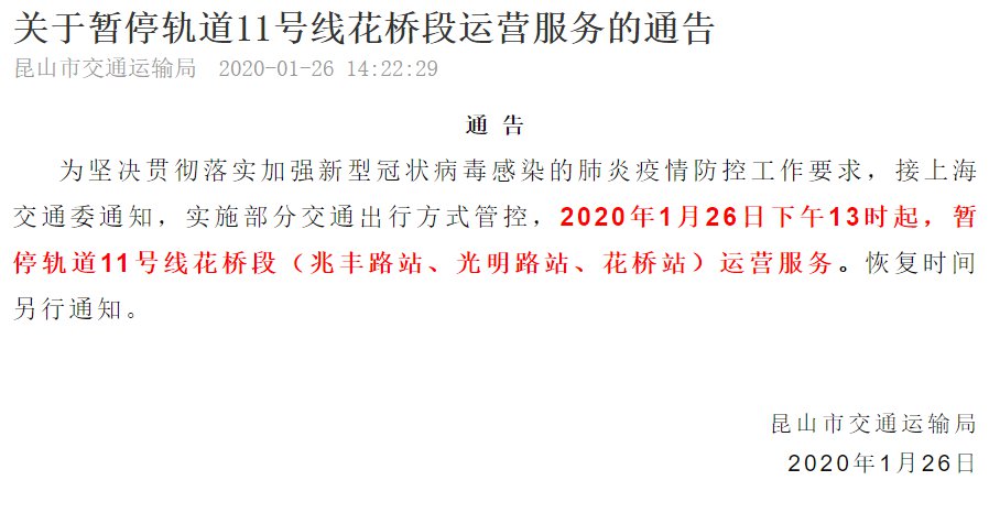 根据昆山市交通运输局2020年1月26日发布的公告,为坚决贯彻落实加强新型冠状病毒感染的肺炎疫情防控工作要求,接上海交通委通知,实施部分交通出行方式管控,2020年1月26日下午13时起,暂停轨道11号线花桥段(兆丰路站、光明路站、花桥站)运营服务。恢复时间另行通知。