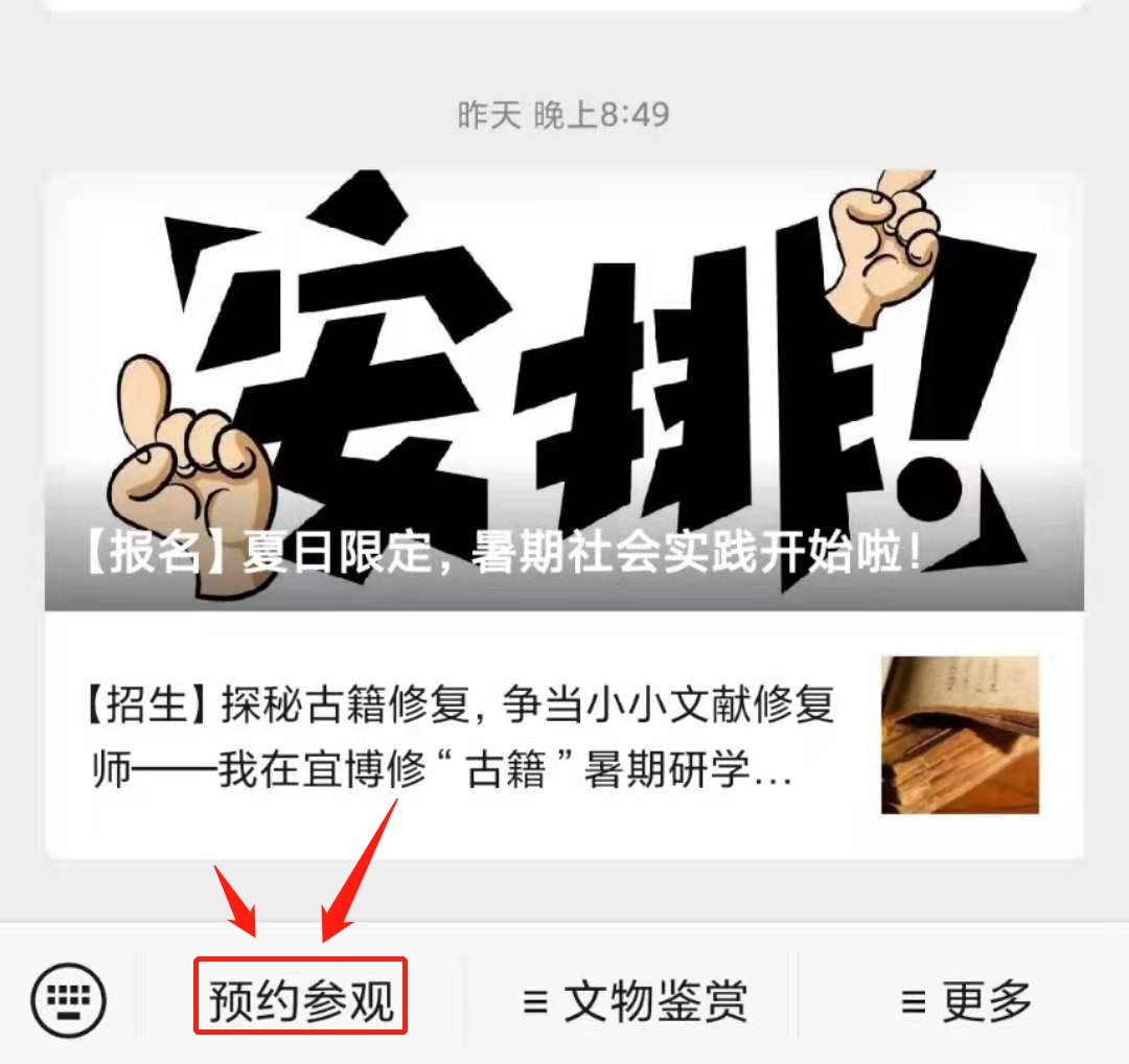 微信搜索并关注公众号“宜兴博物馆”,点击菜单栏“预约参观”,即可进入填写个人信息