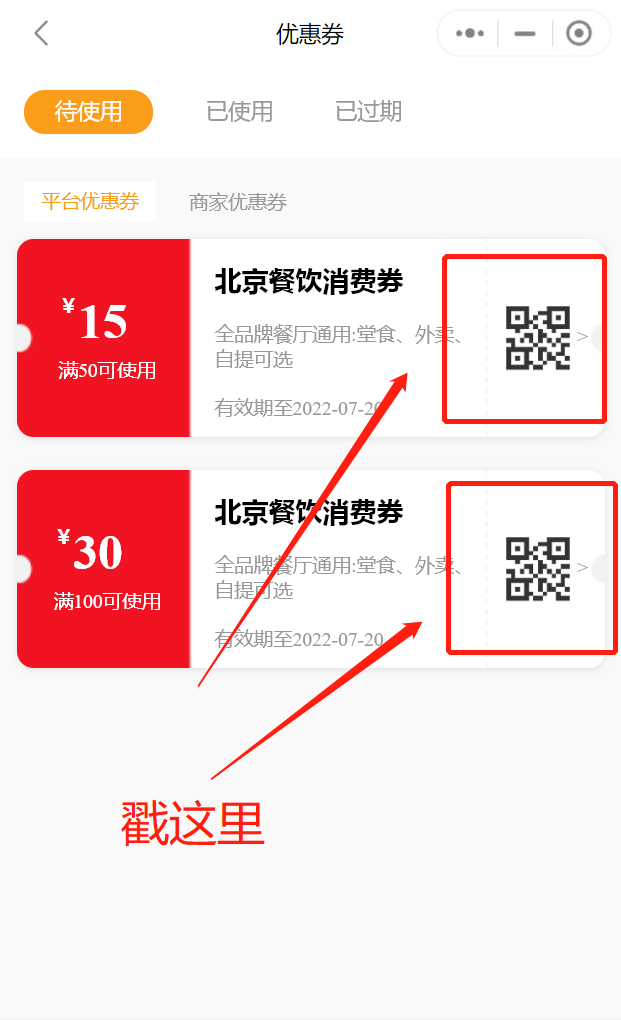 1.门店使用:领券用户在【我的】页面,点击【我的优惠券】,进入页面后可出示消费券二维码,给与门店工作人员扫码核销,如下图: