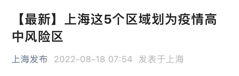 上海市新冠肺炎疫情防控工作领导小组办公室发布8月18日消息:根据《新型冠状病毒肺炎防控方案(第九版)》要求,经研究决定,调整本市以下区域风险等级(具体时间根据相关区域按照国家要求落实相应管控措施起计算):