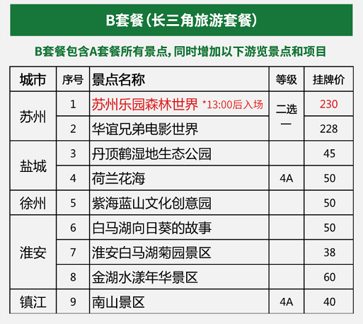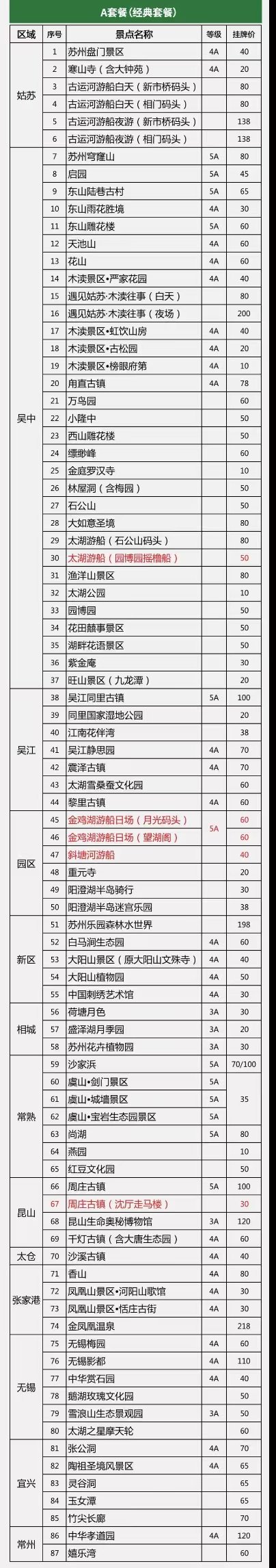2、持休闲年卡可游览下列95个景点(使用期限内累计可刷 100 次,年费A套餐:200元、B套餐:350元):