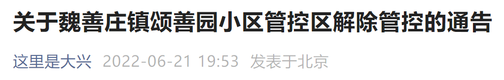 经大兴区新冠肺炎疫情防控工作领导小组批准,按照有关规定,魏善庄镇颂善园小区16号楼以外其他楼栋已于2022年6月15日0时从封控区调整为管控区,目前管控期已满,现就颂善园小区16号楼以外的其他楼栋解除管控有关事宜通告如下: