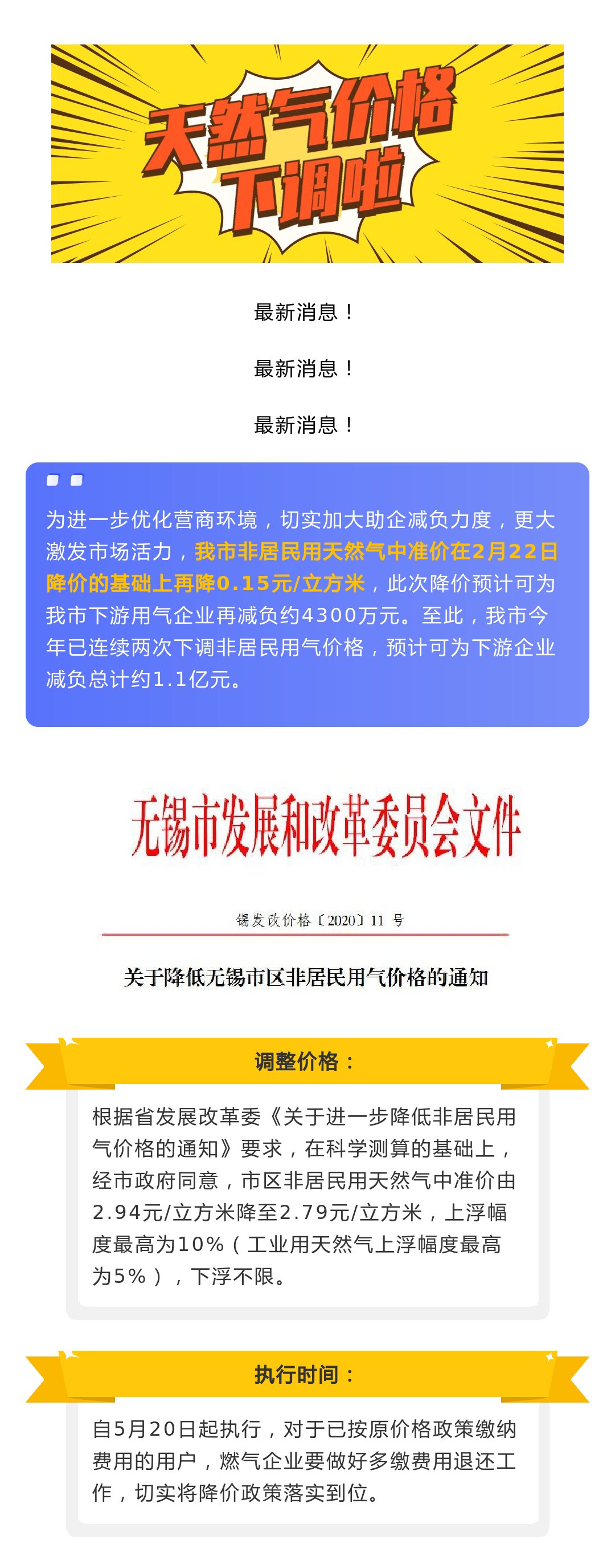 据无锡发改官方微信报道,为进一步优化营商环境,切实加大助企减负力度,更大激发市场活力,无锡市非居民用天然气中准价在2月22日降价的基础上再降0.15元/立方米,此次降价预计可为无锡市下游用气企业再减负约4300万元。
