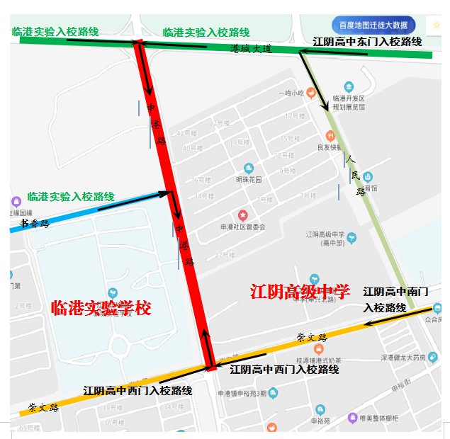 家长统一从书香路或港城大道进入申港路,沿西侧路段至实验学校东门,学生下车后车辆即停即走。