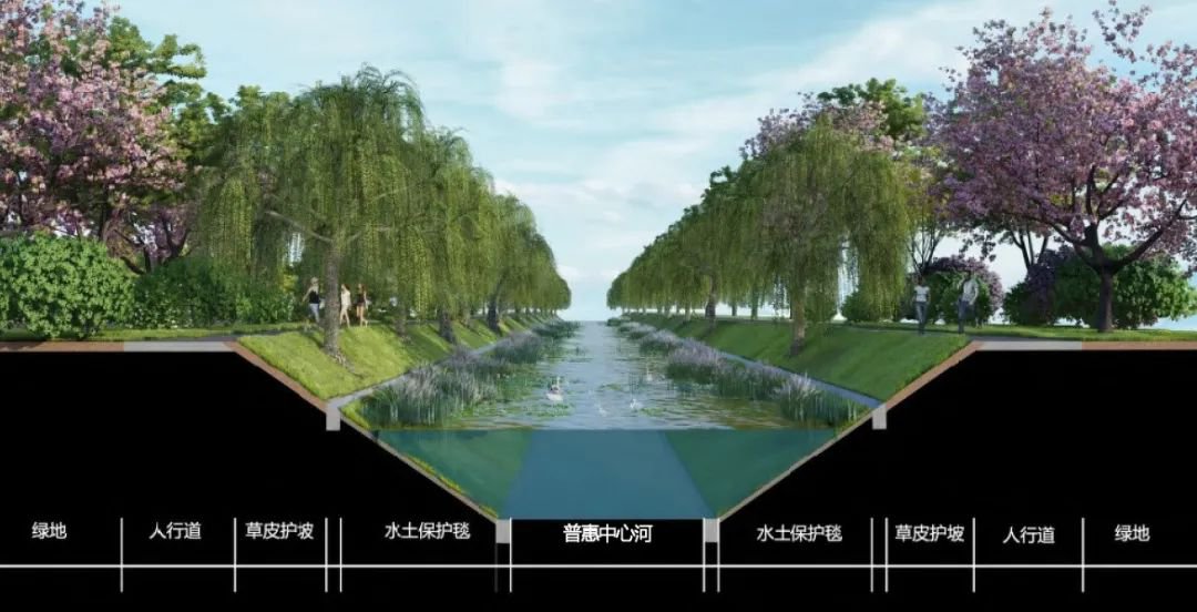 建成以后,老夏港河至普惠中心河段(衡山路东西两侧)采用草皮护坡,沿岸以园林景观为主。普惠中心河至芦花沟河段以生态驳岸为主,采用生态框及草坪。