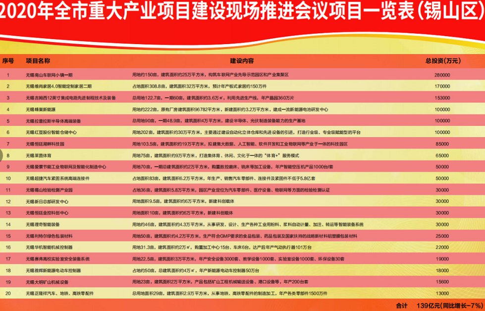 2020年1月2日,无锡锡山区20个重大产业项目集中开工,总投资138.6亿元!具体项目详情如下: