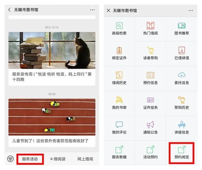 关注“无锡市图书馆”微信公众号,进入底部菜单栏“服务活动”,点击“预约阅览”并授权登录。