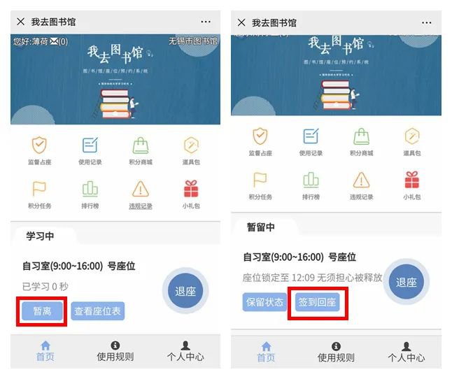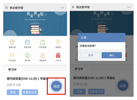 中途离开馆室请点击“暂离”。暂离馆室须在60分钟之内返回并完成“签到回座”,超时系统将自动退座。