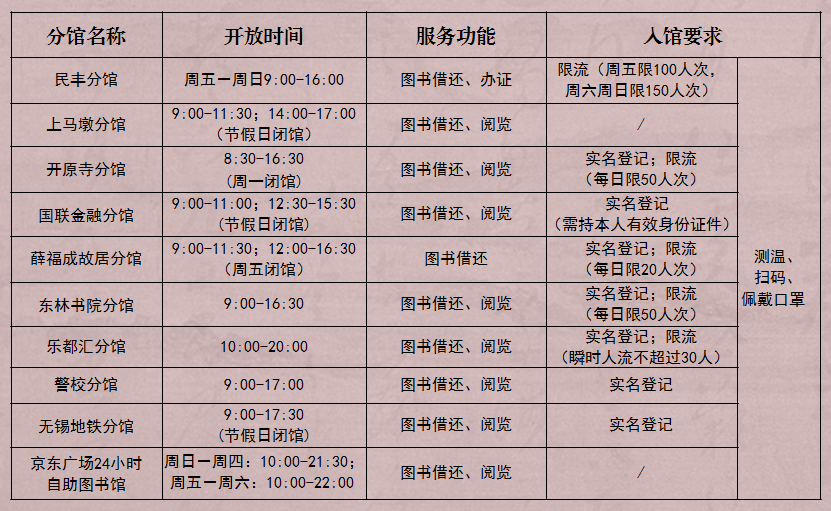 北大门为唯一出入口。读者入馆须佩戴口罩,配合工作人员进行体温检测、出入两次核验“锡康码”(持打印文本须同时核验身份证原件)或“苏康码”“健康通行码”,显示绿码者可入馆。