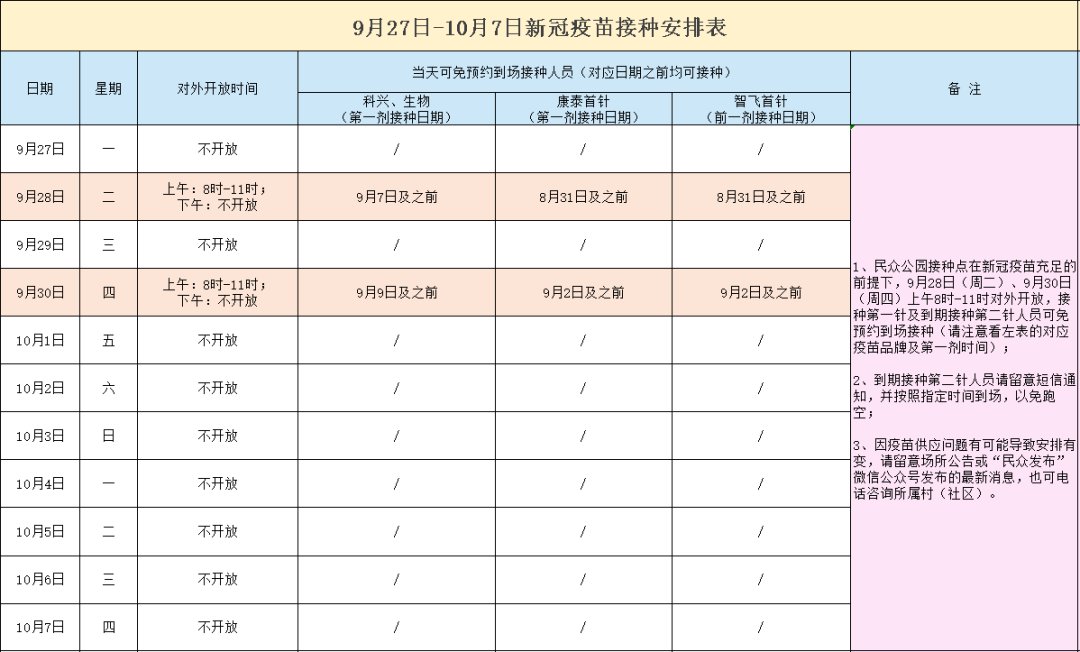 民众街道新冠疫苗临时接种点(民众公园)计划于国庆节期间(10月1日-10月7日)暂停疫苗接种服务,请知悉!不便之处,敬请见谅!