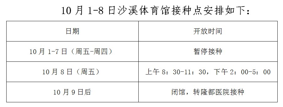 10月1日至10月3日神湾镇医院和社区卫生服务中心新冠疫苗接种点暂停接种疫苗,10月4日8:00至16:30神湾医院新冠疫苗接种点正常接种,10月5日至10月7日暂停接种,10月8日正常接种。