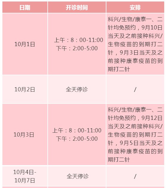10月1日—10月5日暂停接种请勿跑空! 10月6日—10月7日恢复接种接种时间:上午8:30-11:30,下午2:30-5:30