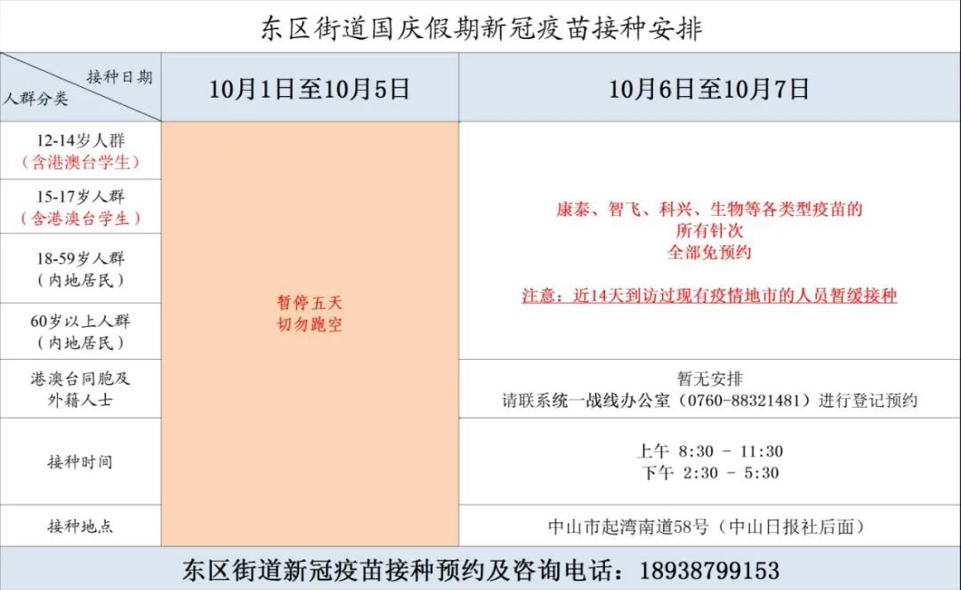 10月1日-4日,坦洲镇新冠病毒疫苗接种门诊暂停提供疫苗接种服务。