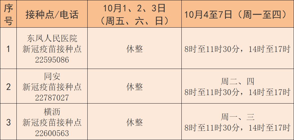 根据新冠疫苗接种工作安排,国庆节期间南朗街道新冠疫苗大型临时接种点将于10月1日至10月5日暂停接种服务5天,10月6日(周三)起恢复接种,接种时间为8:00-17:00。