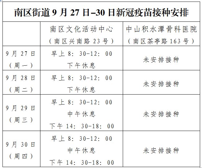 根据工作安排,位于南区街道兴南路23号的南区文化活动中心新冠疫苗接种点将于10月1日(周五)起正式关闭,不再提供新冠疫苗接种服务。现将南区街道9月27-30日的接种安排公示如下,请尚未接种的街坊抓紧时间尽快前往(12岁及以上第一针、第二针均免预约):