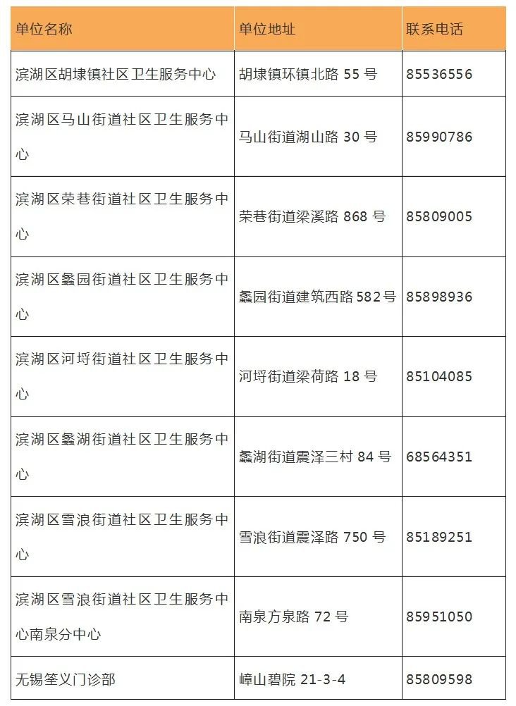 滨湖区疫苗接种门诊一览表