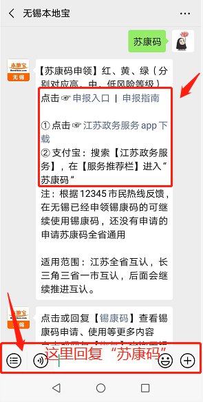温馨提示:微信搜索公众号“无锡本地宝”,公众号聊天框回复“苏康码”,即可进入苏康码申请入口,使用指南等,回复“锡康码”,即可进入锡康码申报入口,查询申报流程;回复“口罩”查询口罩预约购买入口,查询最新消息等!