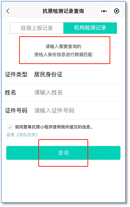 第三步:若居民是查询由医疗卫生机构检测的抗原检测结果,应选择【机构检测记录】,填写需要查询的受检人身份信息,点击【查询】,获取检测结果。