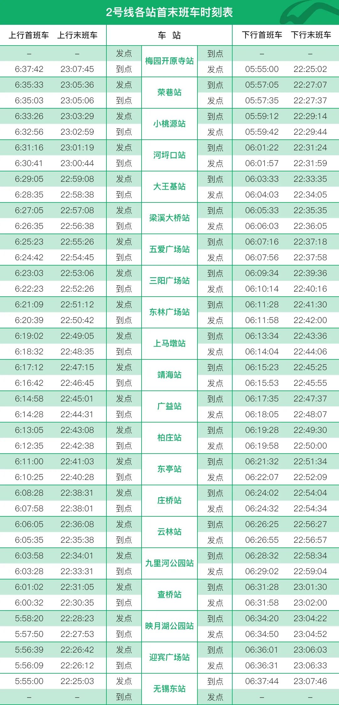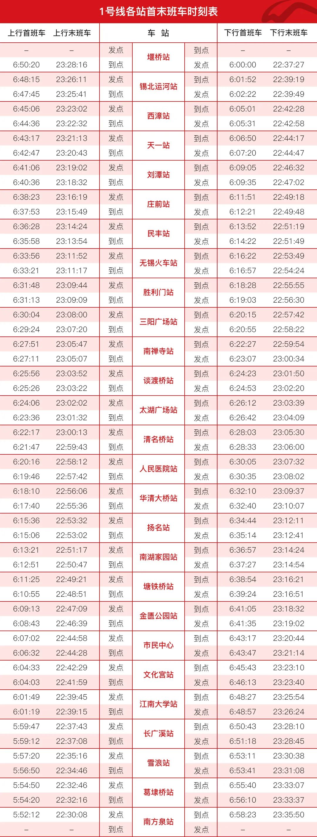 根据2020年3月25日交通运输局发布的《关于基本恢复市区公共交通运营的公告》,自2020年3月26日起,无锡地铁1、2号线始发站首末班车运营时间恢复为6:00-22:30,详见首末班车时刻表。其中,工作日7:00-9:00,运营班次间隔为7分钟,16:30-18:30运营班次间隔为8分钟;周末及节假日10:00-18:00,运营班次间隔为10分钟;其它时段间隔约为12至15分钟。
