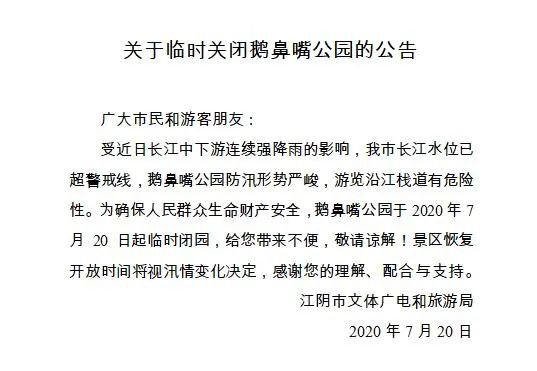 受近日长江中下游连续强降雨的影响,我市长江水位已超警戒线。为确保人民群众生命财产安全,鹅鼻嘴公园景点于2020年7月20日起临时闭园。