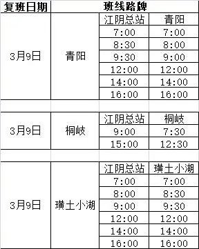 江阴汽车客运站当前所有复班班线(截止至2020年3月6日)