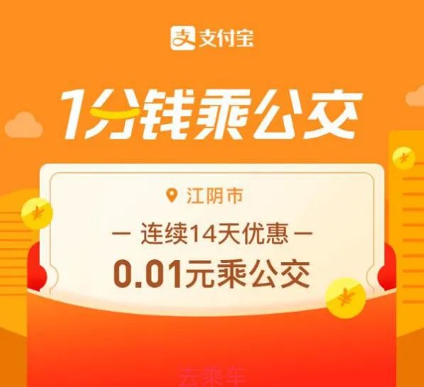 据江阴交通官方微信报道,2020年10月16日到2020年10月29日期间,每天早上5:00开始,使用支付宝刷码乘公交江阴市城镇公交公司所有线路,2元以内票价只需1分钱,2元以上票价优惠1.99元,活动期间共计5.6万个立减名额,同一用户每天可享受1次立减优惠,数量有限,减完即止。
