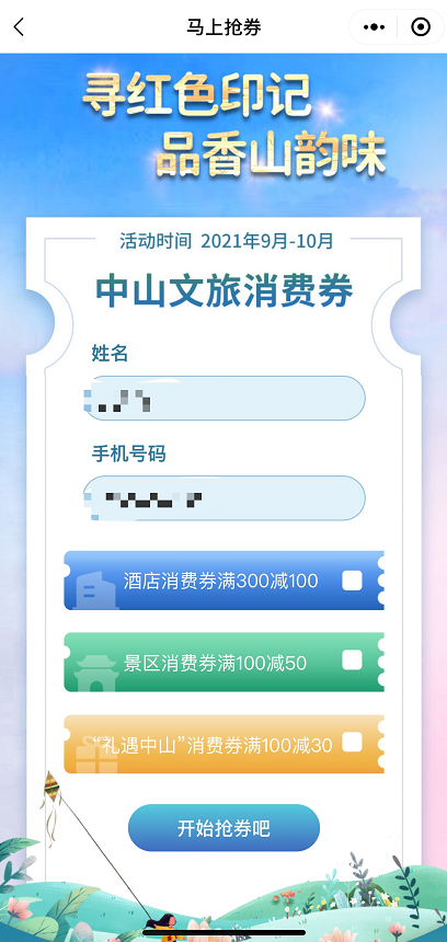 填写姓名和手机,选择酒店消费券、景区消费券或“礼遇中山”旅游手信消费券。