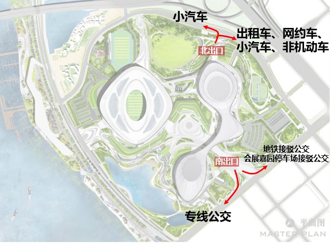 乘坐地铁、公交车的观众从南楼梯离场,乘坐小汽车、出租车、网约车、摩托车、非机动车的观众从北楼梯离场。