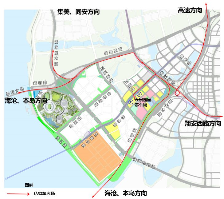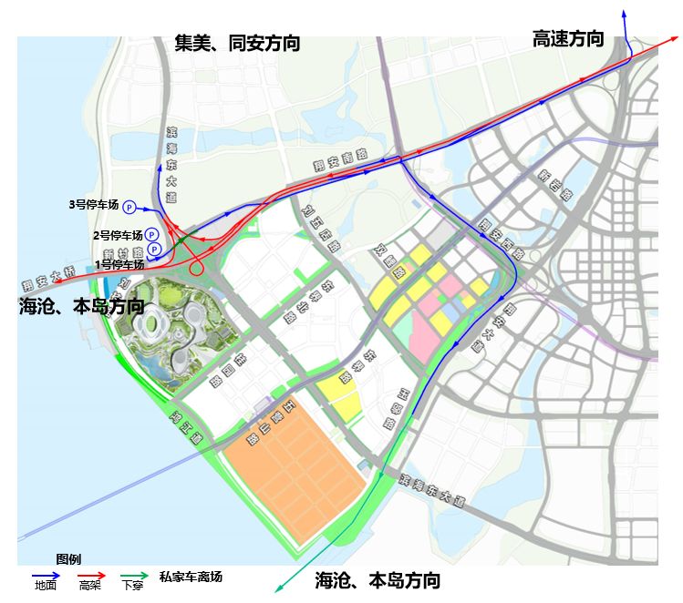 ➤3号停车场:出停车场后进入翔安大桥立交,右转可往岛内,直行可往高速、厦大翔安校区。