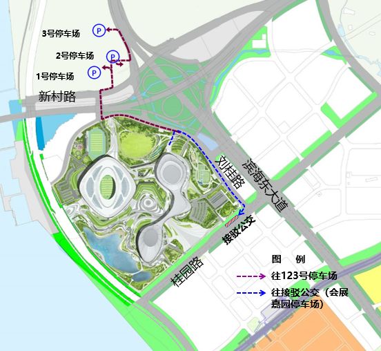 ➤前往会展嘉园停车场的观众出北门后右转,根据指示牌,沿刘桂路,步行至桂园路交叉口右转,乘坐接驳公交车至会展嘉园停车场。步行距离约800m。