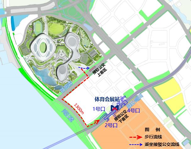 方式二:乘坐接驳公交车至地铁站。在南门东侧乘坐接驳公交车,在体育会展站2、4号口下车后进入地铁站。