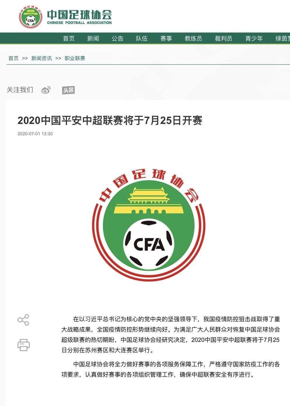 据苏州市体育局官微消息,7月1日下午,中国足球协会网站发布消息,2020赛季中国足协超级联赛将以赛会制形式分别在苏州和大连举行,开赛时间定在7月25日。