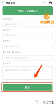 02、准确填写留言人姓名、联系方式、逝者姓名、墓穴位置(区-排-号)和留言内容,点击提交按钮,公墓收到留言信息会将留言以寄语卡片的形式放置在逝者墓碑旁。(每个微信用户只能留言一次)